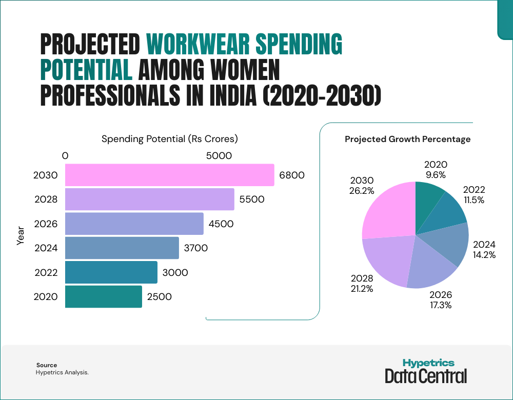 According to the Hypetrics modelling framework, if 30 – 35 percent of India’s estimated 43 million urban women professionals allocate ₹10,000–₹15,000 annually toward workwear, the category could represent a ₹4,500–₹6,000 crore addressable segment within the broader women’s apparel market.